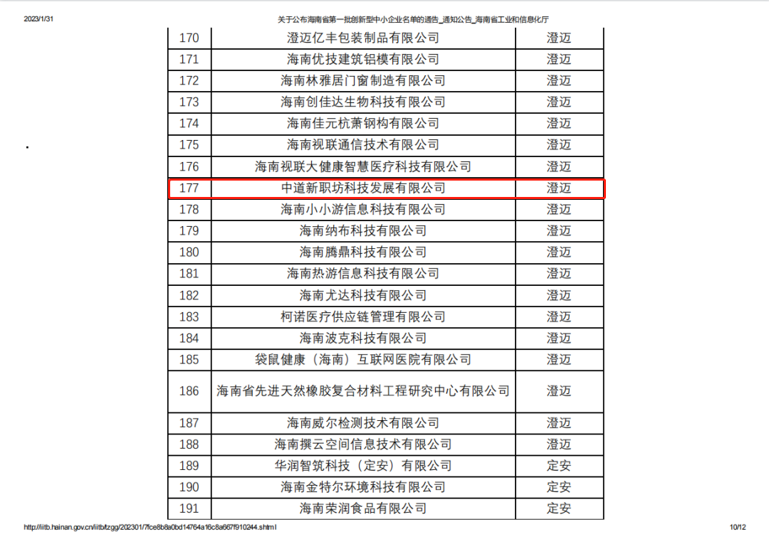 1月31日根据工业和信息化部《优质中小企业梯度培育管理暂行办法》和《海南省优质中小企业梯度培育管理实施细则》的有关要求,中道新职坊科技发展有限公司(以下简称中道新职坊)荣获海南省第一批创新型中小企业名单位,列第177号。