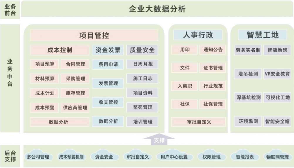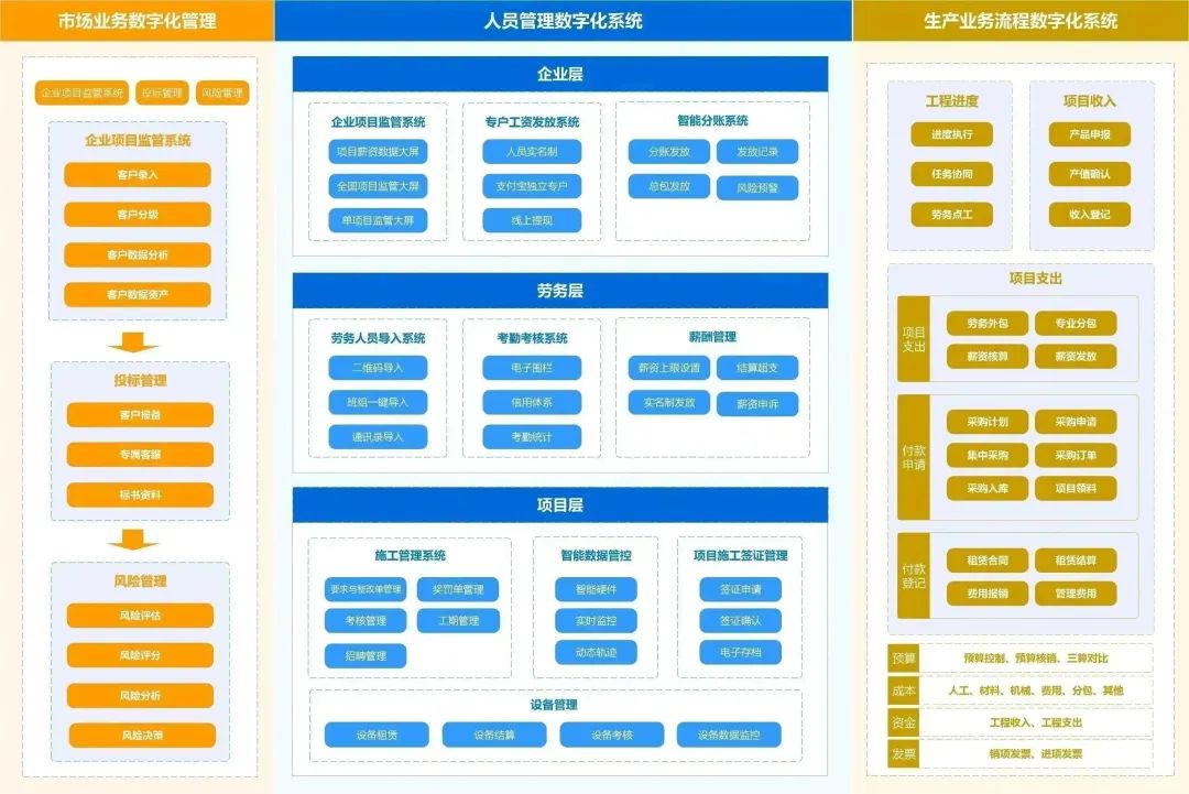 作为一家以高新科技为生产力的技术集成型企业,历经多年行业沉淀和理论积累,针对建筑施工过程中的风险预控、施工管理的提质增效、劳务纠纷、资金压力的缓解等问题,提供全域数字化解决方案,致力于打造建筑行业数字化转型三部曲解决方案,助力中国建筑企业的数字化转型。解决方案贯穿前期业务拓展、项目跟进,到项目施工阶段的全流程管理,以及施工现场的人、材、机管理,以实现提质增效为目标,助力建筑企业的数字化转型。