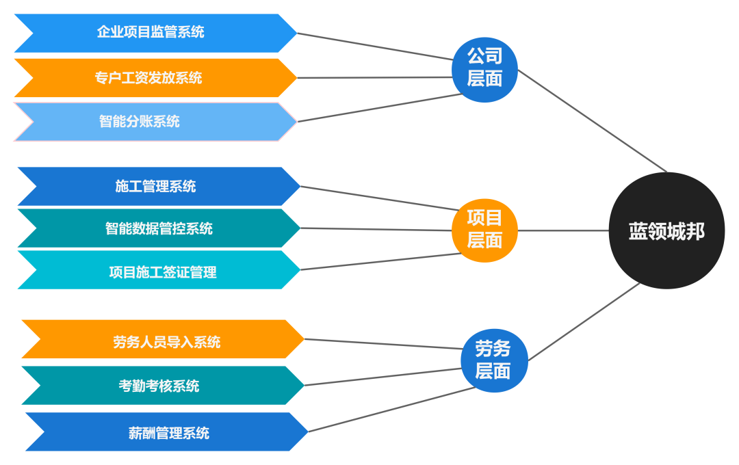 平台拥有三个层级九大核心系统,有效解决目前建筑企业人员管理的5大痛点,管理人员互相包庇,推诿扯皮,工作效率低下;项目管理人员履职情况不清晰,存在管理盲区;现场工人班组情况不清楚不了解,劳资纠纷频发;甲方签证不及时,工程款索要难;安全质量事故频发,难掌控。蓝领城邦人员数字化管理解决方案将对用工全过程进行智能化管理,构建和谐高效的用工环境,提高管理人员效能。