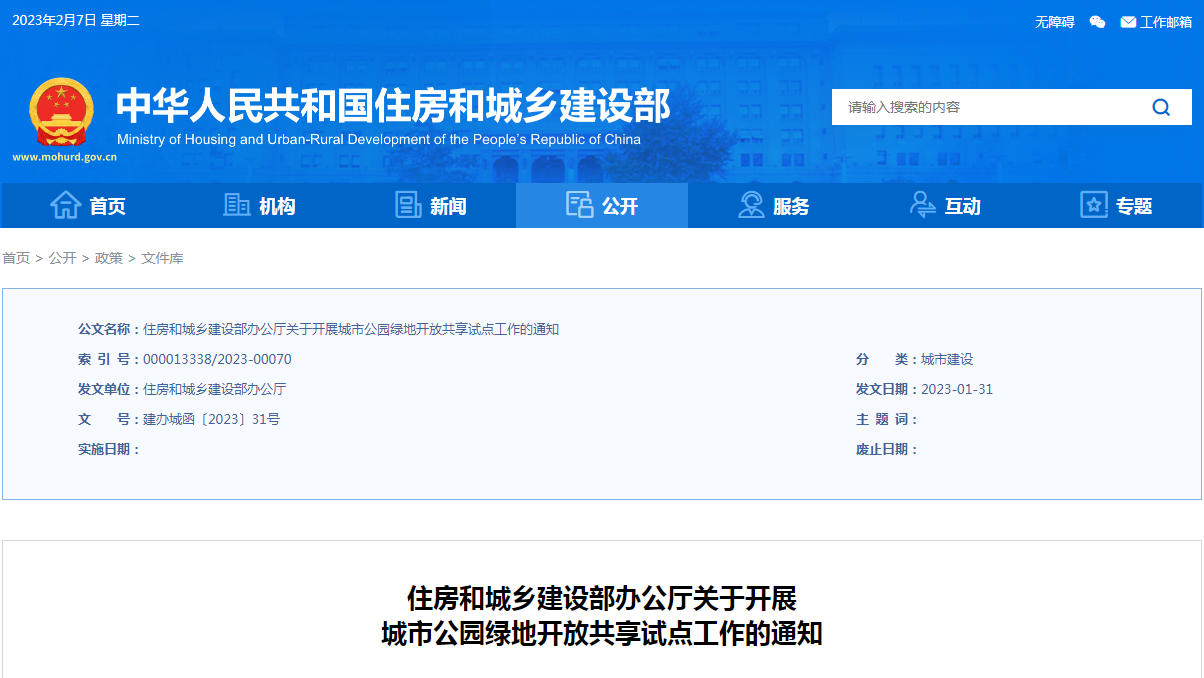 为贯彻落实党的二十大精神,完整、准确、全面贯彻新发展理念,拓展公园绿地开放共享新空间,满足人民群众亲近自然、休闲游憩、运动健身新需求新期待,决定开展城市公园绿地开放共享试点工作。现将有关事项通知如下。随着经济社会发展和人民生活水平不断提升,特别是受疫情影响,人民群众对城市绿色生态空间有了新的需求,希望增加可进入、可体验的活动场地。在公园草坪、林下空间以及空闲地等区域划定开放共享区域,完善配套服务设施,更好地满足人民群众搭建帐篷、运动健身、休闲游憩等亲近自然的户外活动需求,是扩大公园绿地开放共享新空间的重要举措。各地住房和城乡建设(园林绿化)主管部门要牢固树立以人民为中心的发展思想,充分认识推动公园绿地开放共享、提升公园多元服务功能的重要意义,按照试点先行、积累经验、逐步推开的原则,积极推动开放共享试点工作。各省级住房和城乡建设(园林绿化)主管部门要组织本地区有关城市开展公园绿地开放共享试点工作,试点时间为1年。其中,南方地区(华南、华东、华中以及除西藏以外的西南地区)要按照应试尽试原则,积极开展试点工作,逐步扩大开放共享区域。其他地区可根据实际情况选择试点城市,合理确定开放共享区域,以点带面,逐步探索建立轮换制养护等管理机制,不断推动城市公园绿地开放共享。各省级住房和城乡建设(园林绿化)主管部门研究确定开展试点工作的城市,并按要求组织好试点工作。(一)摸清底数(2023年2月中旬—3月上旬)。各试点城市要认真梳理公园绿地中的空闲地、可供游憩活动的草坪区和林下空间等,以及周边卫生间、垃圾收集点、售货点、安全监控等服务设施配置情况,建立可供开放共享的绿地台账。开放共享区域应处于地形相对平整,服务设施、应急保障相对完善和便捷的区域,避开存在自然灾害风险以及生态脆弱区域,避开易干扰野生动物繁衍和活动区域。(二)编制方案(2023年3月中旬—4月上旬)。各试点城市要科学编制试点实施方案,根据实际情况确定公园绿地中可开放共享区域、开放时间、可开展的活动类型、游客承载量,以及完善设施配套、提升服务功能、加强植物养护管理和游客服务保障等措施。其中,开放用于游憩活动的草坪区域要根据植物生长周期和特性,可推广地块轮换养护管理等制度,避免植被被过度踩踏影响正常生长。鼓励各地拓展开放共享的绿地类型,增加绿色活动空间。开放共享区域禁止使用明火。(三)开展试点探索(2023年4月中旬—10月下旬)。试点城市根据试点实施方案组织好试点工作,可结合实际分批次开放有条件的公园绿地等绿色空间。确定开放的区域通过本地媒体主动公开开放共享的区域范围、开放时间、可开展的活动类型、使用要求等。根据人民群众使用需求和试点中发现的问题,不断完善开放共享区域养护管理制度和配套服务设施,提升精细化管理服务水平。加强安全管理,遇暴雨、大风、高温等极端天气,应采取临时关闭等动态管理措施,并通过通告等形式提前通知。(四)总结试点经验(2023年11月上旬—12月上旬)。各试点城市围绕划定开放共享区域的选址要求、配套服务设施建设运行、植物养护管理制度、游客服务保障和应急管理机制建设等进行认真总结,研究编制符合本地区实际的开放共享区域划定管理技术指南,不断完善相关管理制度,提出进一步开放共享公园绿地的思路和对策。(一)完善工作机制。各级住房和城乡建设(园林绿化)主管部门要牵头建立多部门协同的工作机制,形成部门合力。各省级住房和城乡建设(园林绿化)主管部门要及时了解试点城市工作进展,及时分析试点城市遇到的困难和问题,通过组织工作交流、专家调研等给予指导和支持。